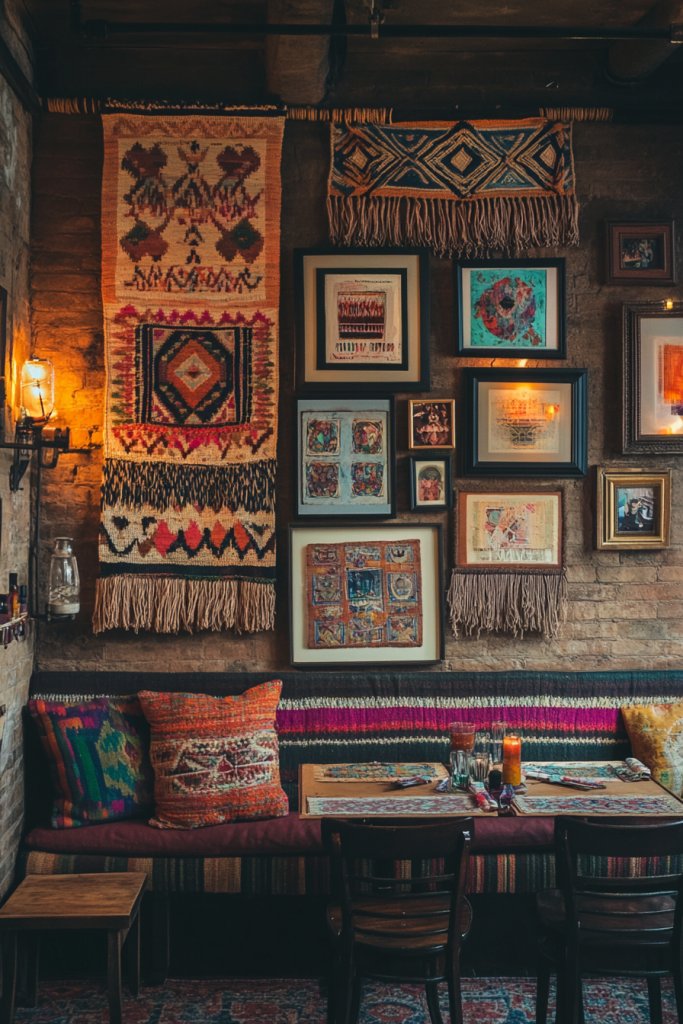 Envision a wall layered with textured woven hangings, macramé, and framed art—each piece telling a story through fibers, patterns, and colors. The mix of soft textiles and curated prints creates a tactile, cozy atmosphere. Earthy tones, natural materials, and layered textures make the wall feel inviting and effortlessly stylish. The overall aesthetic combines artisanal charm with modern sensibility, perfect for relaxed dining gatherings.