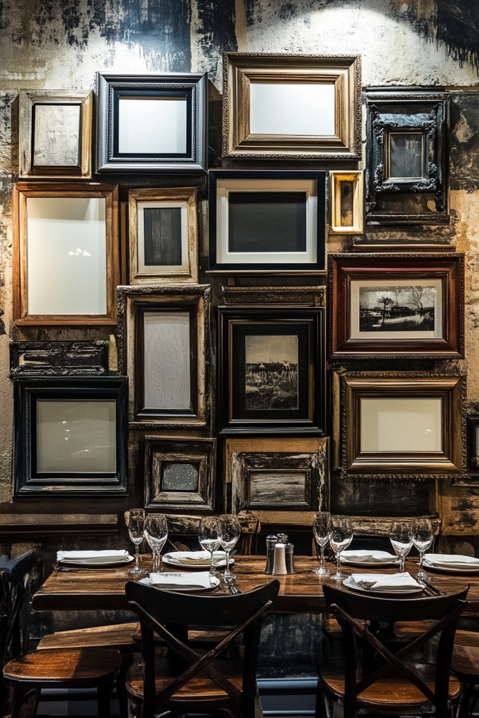 Choose frames with a matte or glossy finish, and experiment with different shapes—square, rectangular, or round—for variety. Swap out artwork or photos seasonally, using bold colors or monochrome with a pop of color. Incorporate metallic or matte black accessories nearby to reinforce the industrial theme. This style suits both open-plan spaces and more intimate dining areas.