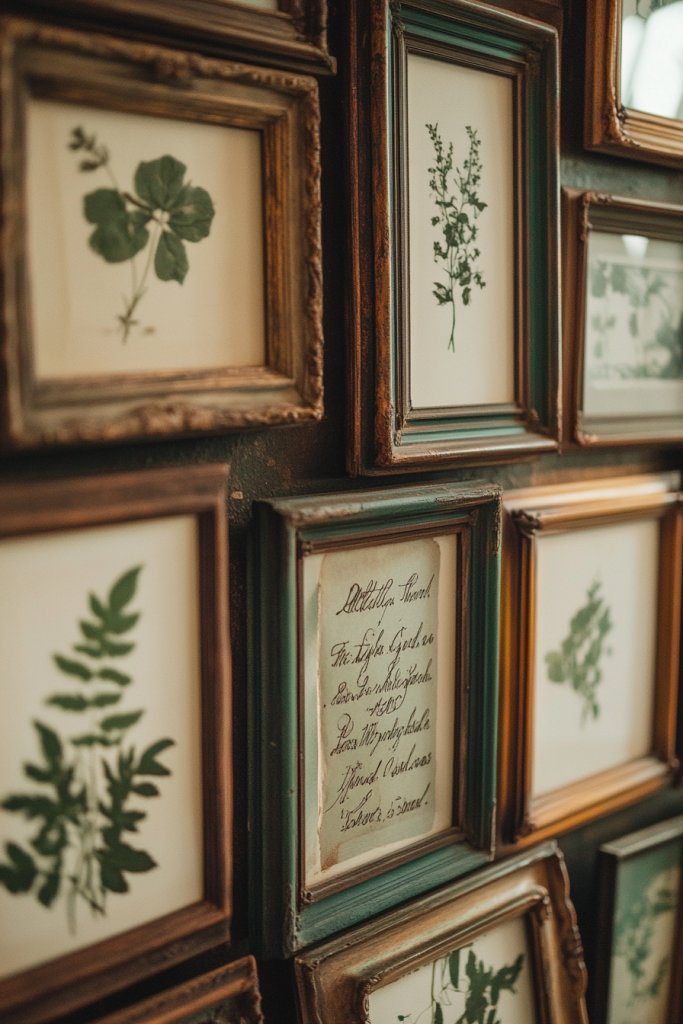 Collect vintage frames from flea markets, thrift stores, or online. Choose botanical prints and quotes that resonate with you, printed on textured or high-quality paper. Arrange the frames on the floor first, then hang them with appropriate hardware, maintaining close spacing for a clustered look. Use a level to ensure alignment. Regularly clean the glass and frames to maintain their vintage charm.