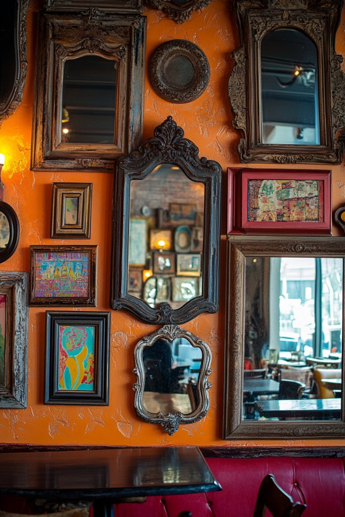 Picture a wall full of mismatched vintage mirrors reflecting ambient light, combined with art frames filled with colorful prints or textured backgrounds. The variety in shapes, sizes, and styles creates a lively, dynamic visual that draws the eye and sparks curiosity. The mirrors subtly bounce light around, making the room feel brighter and more spacious. The overall vibe is bohemian, nostalgic, and full of personality.