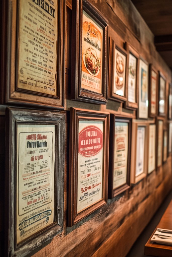 Picture a series of framed vintage labels for soda, jam, or spices, paired with old menu cards or handwritten recipes. The aged paper, ornate fonts, and classic illustrations evoke a sense of history and craftsmanship. The collection creates a warm, cozy atmosphere, reminiscent of old kitchens or vintage cafes. It’s a charming way to celebrate culinary traditions and family recipes.