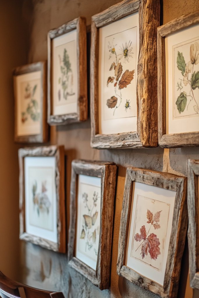 Imagine a grouping of weathered wooden frames arranged in a cluster, each showcasing prints or quotes that evoke the current season—like autumn leaves or winter snowflakes. The natural wood tones contrast beautifully with neutral wall colors, adding warmth and depth. The textured frames bring a tactile element, making the display feel handcrafted and heartfelt. The overall effect is cozy, rustic, and perfectly aligned with seasonal decor shifts.