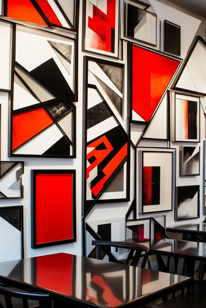 Visualize a carefully curated arrangement of sleek, geometric-shaped frames—triangles, squares, hexagons—creating a dynamic composition. Inside each frame, bold abstract prints with vibrant colors or monochrome shades add visual interest. The geometric shapes contrast with the organic forms of traditional art, creating a modern edge. The overall look is energetic, organized, and eye-catching, giving your dining area an upscale, gallery-like feel.