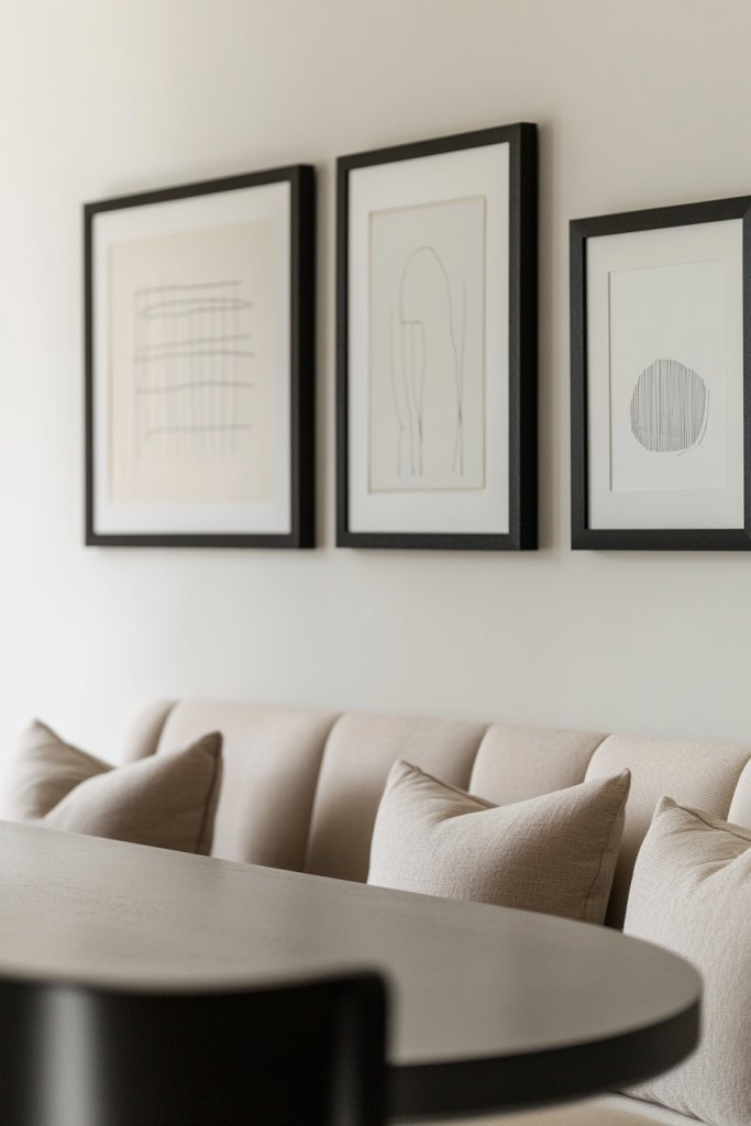 Looking to make a bold statement in your dining space? A modern geometric frame layout filled with abstract prints can instantly transform your wall into a contemporary art piece. It’s perfect for those who love clean lines, bold shapes, and a touch of sophistication. Plus, it adds a fresh, stylish vibe that elevates your entire room.