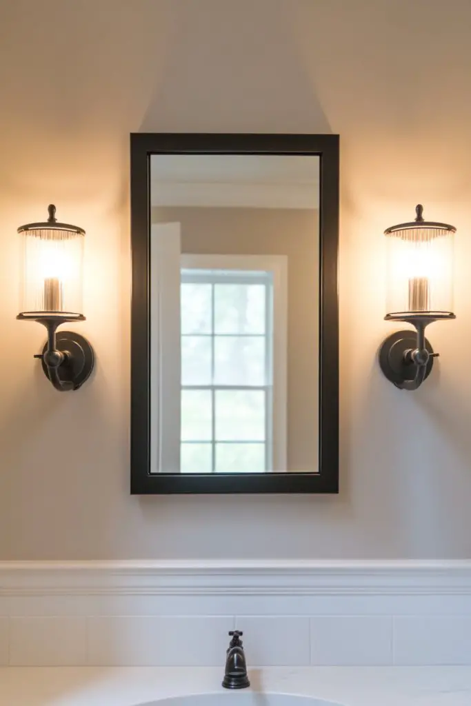 Picture a pair of vintage-inspired sconces flanking your mirror or a modern pendant hanging from a decorative chain. The warm glow highlights your features and creates a cozy atmosphere. Textured glass or matte metal fixtures add visual interest and complement your decor. The layered lighting makes the bathroom feel more welcoming and thoughtfully designed.