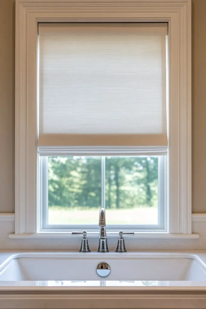 Imagine a soft, textured Roman shade or curtain in waterproof fabric, gently framing your window. The fabric filters light softly, creating a calming ambiance. Choose playful patterns or solid colors to complement your decor. The fabric’s water-resistant quality ensures it stays looking fresh despite humidity and splashes.