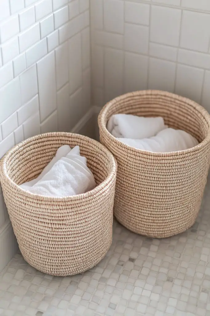 Picture woven or fabric baskets in natural fibers, placed near your shower or vanity. They hold dirty clothes or extra towels, keeping everything within arm’s reach. The textures, whether rattan, seagrass, or canvas, add visual interest and complement your decor. A neatly arranged set of baskets creates a curated, inviting vibe.