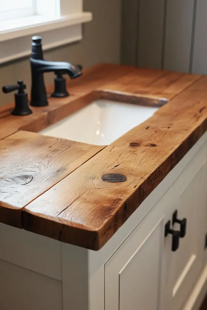 Visualize a rugged wood slab with natural knots and grains, sealed to withstand moisture. The warm tones contrast beautifully with sleek modern fixtures or vintage-inspired hardware. Imagine the textured surface catching the light, adding depth to the vanity area. The earthy, natural finish creates a cozy, inviting atmosphere in your bathroom.