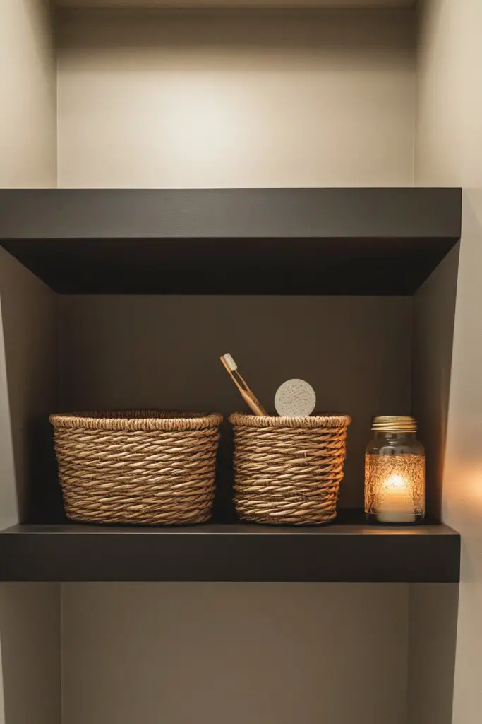Imagine sleek floating shelves mounted above your vanity or toilet, lined with woven baskets or decorative boxes. The open design allows you to see everything at a glance, reducing chaos. Fill baskets with neatly folded towels, toiletries, or decorative accents like candles—creating a balanced, curated look. The natural textures of baskets add warmth and visual interest against sleek tile or painted walls.