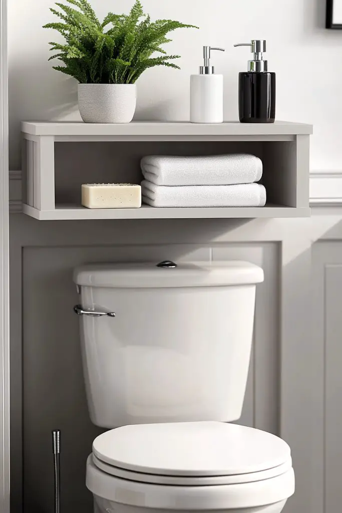Picture a sleek, multi-tiered shelf above your toilet, made from wood, metal, or even acrylic. It holds neatly folded towels, baskets, or decorative jars, making the most of vertical space. The unit blends seamlessly with your decor, whether modern, rustic, or vintage. The open design keeps everything accessible and visually balanced, preventing the space from feeling cramped.