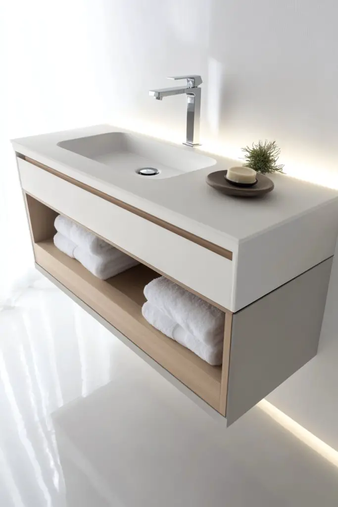 Imagine a slim, wall-mounted unit with open shelves or cubbies, painted in a neutral tone or stained wood. The open design reveals neatly organized baskets, towels, or toiletries—keeping everything accessible. The floating look exposes more floor space, making the bathroom appear larger and more airy. Soft lighting underneath or nearby adds a warm glow, completing the aesthetic.
