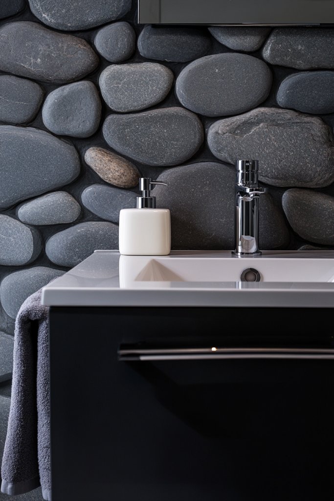 Imagine walls in a gentle pebble gray, paired with matte fixtures and textured tiles resembling natural stone. The color’s soft undertones help reflect light subtly, making the space feel larger and more inviting. Complement it with natural wood accents or woven baskets for storage. Soft, diffused lighting enhances the tranquil vibe, turning your bathroom into a retreat.