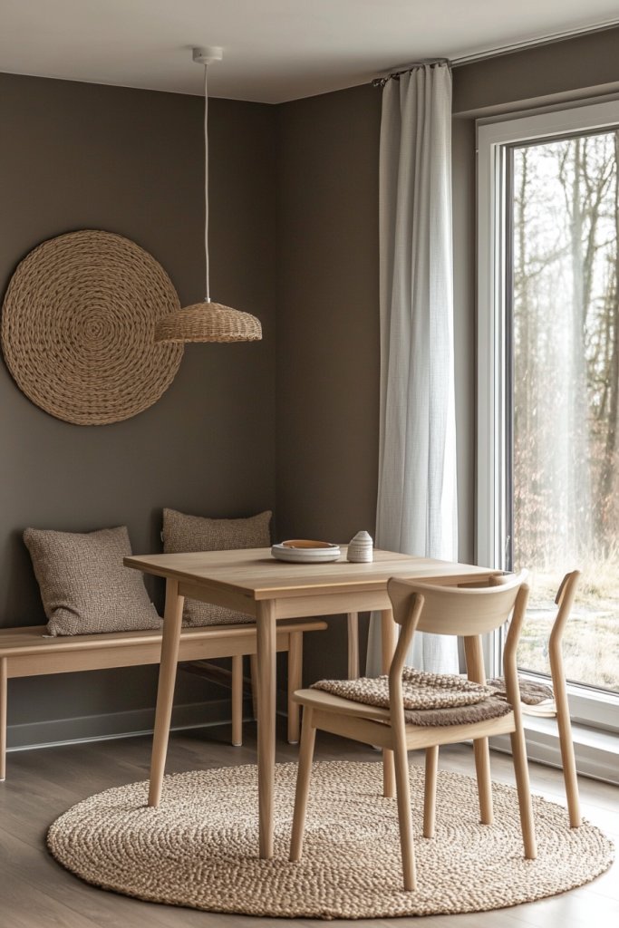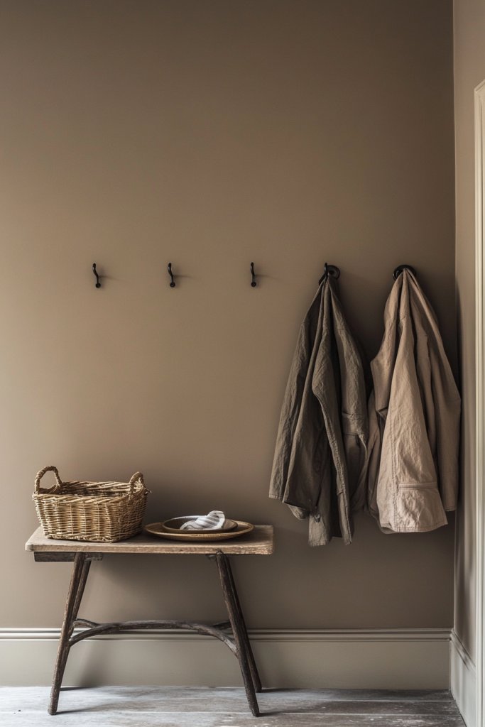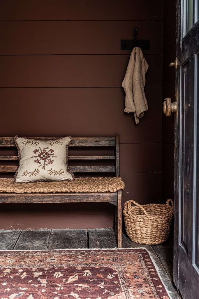 Picture walls in deep cocoa brown paired with distressed wood trim and vintage-inspired hooks or coat racks. The hue’s warmth makes any space feel more intimate, especially when illuminated by warm-toned lighting. Add a textured rug in natural fibers or a woven bench to complete the rustic look. It’s like welcoming guests into a cozy cabin.
