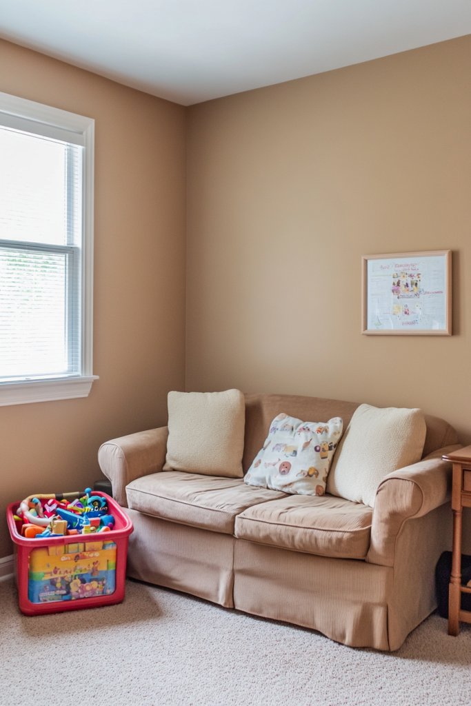 Visualize walls in a gentle clay beige paired with durable, washable paints. Add soft textiles like plush rugs and cotton curtains for comfort. Wooden furniture or storage units in natural finishes keep the look grounded. The space feels nurturing and resilient, ready to handle the chaos of family life while still looking stylish.