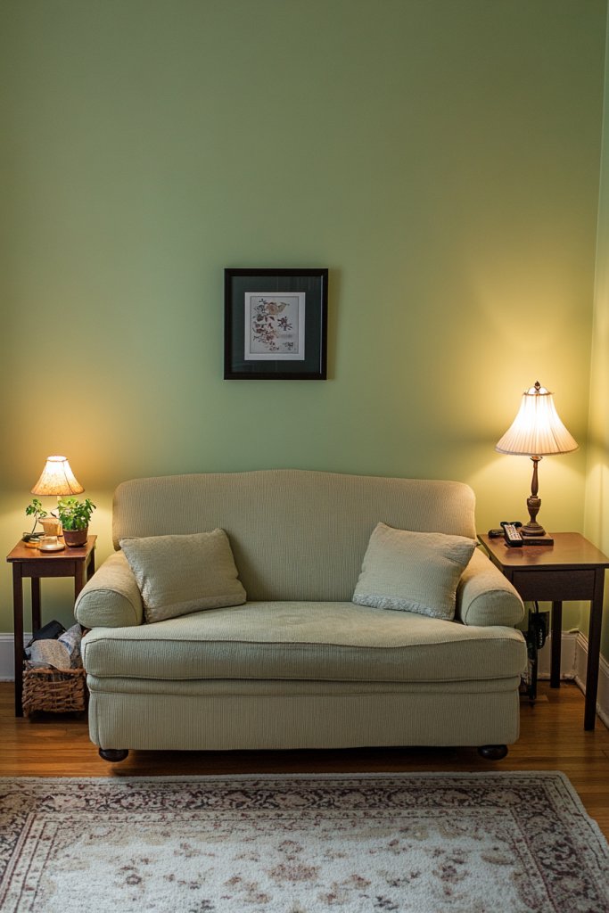 Picture walls painted in a gentle sage green, accented with natural wood furniture and soft textiles. The warm undertones make the space feel cozy, not cold, while the muted hue keeps it sophisticated. Layering with textured cushions or a plush rug enhances the inviting vibe. Natural light makes the color glow, creating a tranquil, harmonious environment.