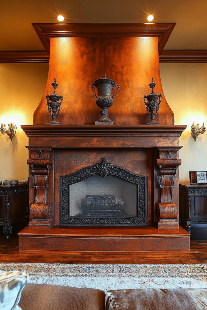 Visualize a fireplace surrounded by rich, cocoa-colored paint paired with textured stone or reclaimed wood mantels. The deep hue creates a grounded, inviting vibe, especially when illuminated by flickering candles or a roaring fire. Woven or leather accessories nearby enhance the rustic feel. The overall look is warm, tactile, and full of character—like a cabin retreat.