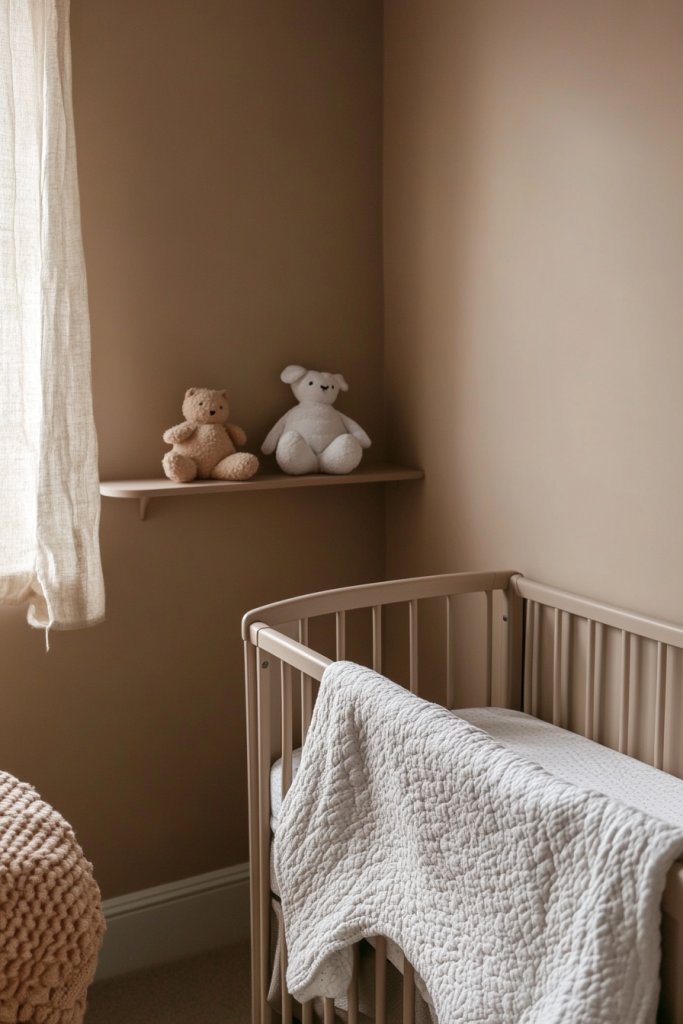 Imagine walls painted in a muted clay hue, complemented by organic cotton bedding and natural wood furniture. The soft, neutral tone creates a peaceful backdrop for playful toys and handcrafted decor. Soft lighting and textured textiles, like a plush rug or cozy curtains, enhance the calming atmosphere. It’s a space that feels safe, warm, and inviting.