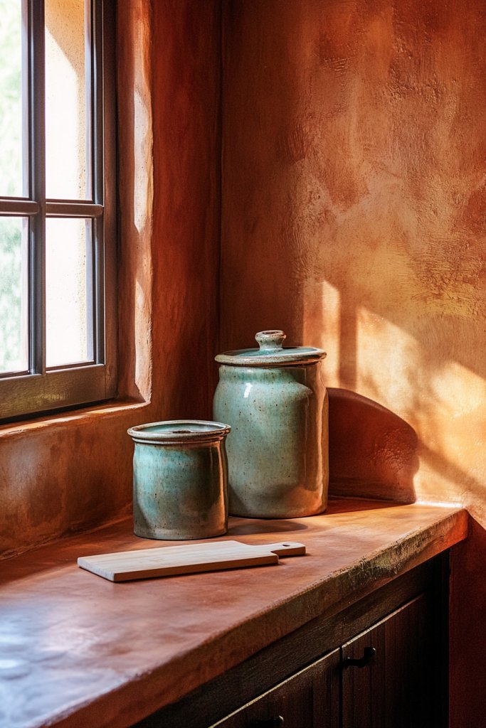 Imagine walls coated in warm terracotta that glow with a natural, clay-like hue. Complement it with distressed wooden cabinets and open shelving to add texture and authenticity. A backsplash of hand-cut tiles in varying earthy tones enhances the organic feel. The overall effect is cozy, welcoming, and full of character—like a Mediterranean retreat right in your home.