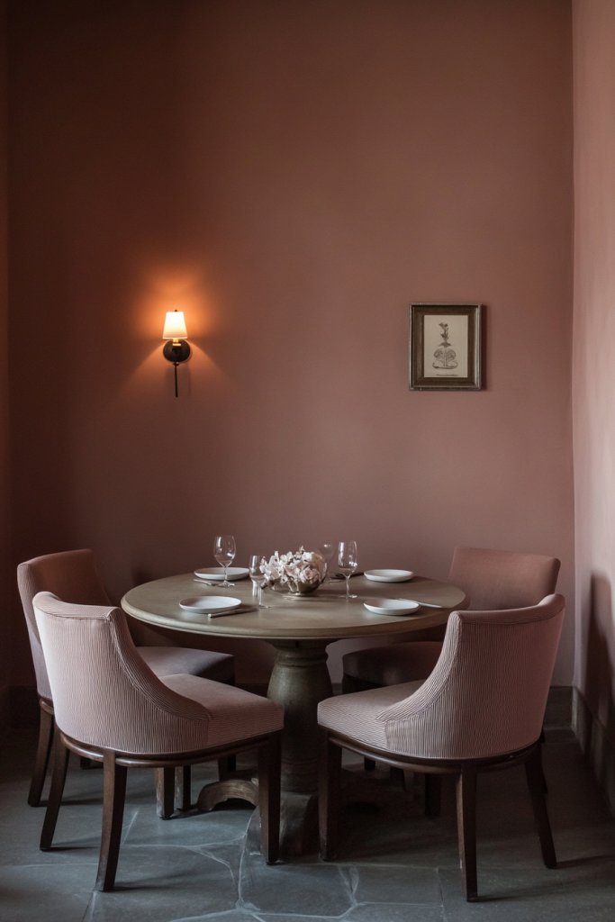 Imagine walls painted in a muted, dusty rose that pairs beautifully with natural wood or matte black furniture. Complement it with a linen tablecloth and simple ceramic dinnerware for a refined look. Textured wall accents like subtle plaster or fabric panels add depth. Soft lighting from candle-like fixtures or warm bulbs accentuates the warm undertones, creating an intimate atmosphere.