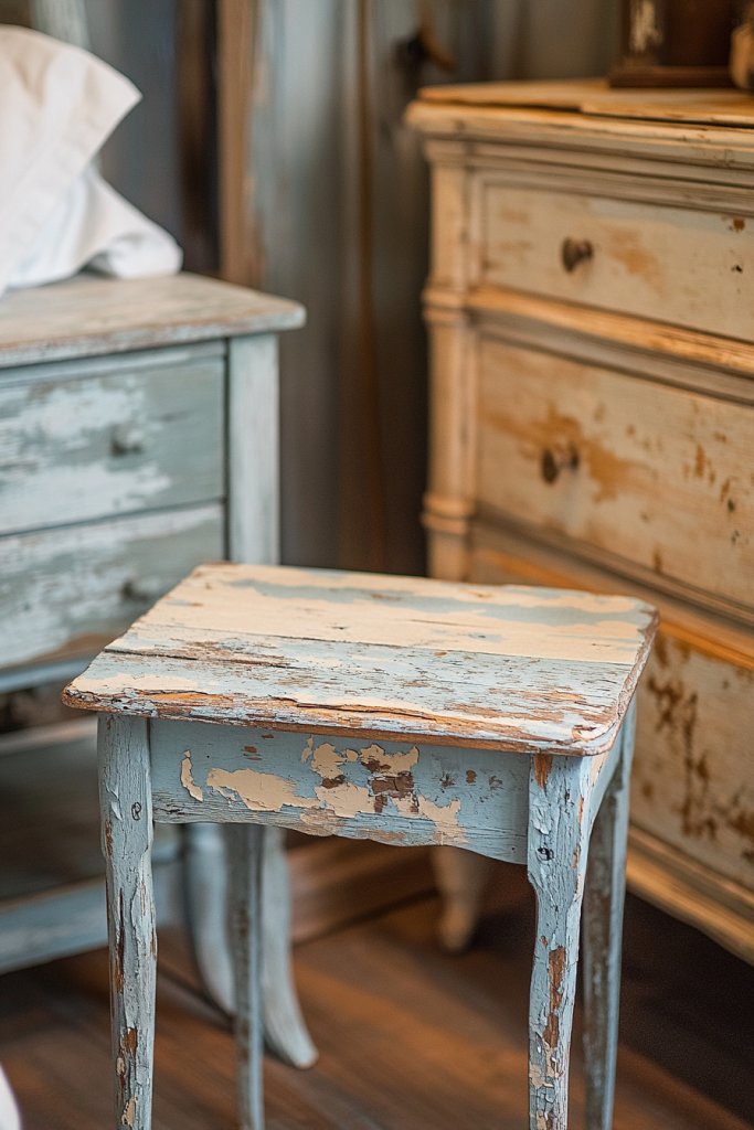 Visualize a vintage dresser with chipped white paint revealing layers of soft pastel underneath. Picture an old wooden stool with faded, distressed blue paint, placed next to a cozy armchair. These pieces evoke a sense of nostalgia and craftsmanship, making your space feel warm and lived-in. The distressed look complements natural textures like linen, rattan, or wicker, enhancing the cottage aesthetic.