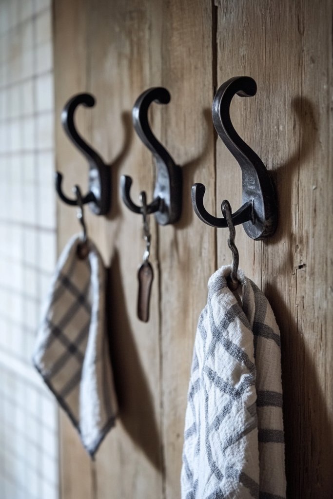 13. Hang Wrought Iron or Vintage-Style Wall Hooks for Practical Decor