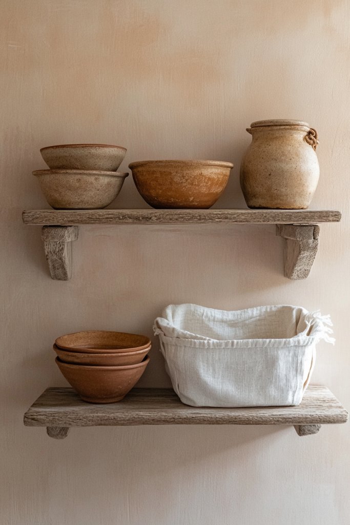 Visualize open wooden shelves displaying simple earthenware dishes, vintage cups, or ceramic jars. Pair these with linen baskets filled with linens or small household items, adding soft textures and natural tones. The combination creates a layered, lived-in look that’s both practical and charming. The natural materials and simple design evoke a relaxed, country vibe, perfect for cottage decor. Every shelf becomes a mini gallery of functional art.