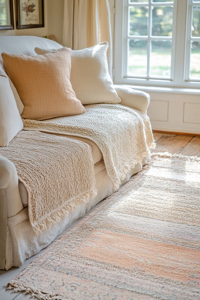Picture a chunky patchwork throw draped over a vintage armchair or layered on a cozy bed. Imagine intricate quilting patterns in soft fabrics—flannel, cotton, or wool—in muted or vibrant colors. These textiles add tactile richness and visual interest, making your space feel layered and inviting. Every stitch and patch tells a story, enhancing the cottage charm with a sense of history and craftsmanship.