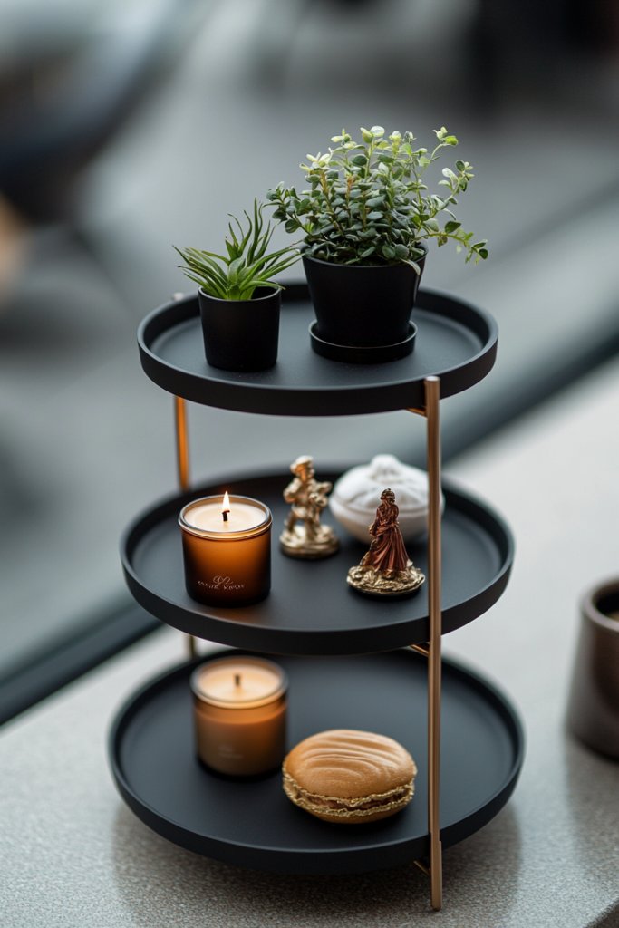Personalize with decorative labels, colorful trays, or textured fabrics on the tiers. Add seasonal accents like mini pumpkins, pinecones, or holiday-themed items. Use small decorative objects like vintage keys or jewelry on the stand for added character. Adjust the layout periodically to reflect changes in your daily routine or mood.