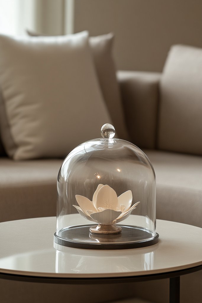 Picture a clear glass dome covering a vintage key, a tiny sculpture, or a unique collectible. The dome’s shape magnifies the item beneath, creating a focal point that draws attention. Soft ambient lighting or natural light highlights the textures and details, making the display feel like a mini museum exhibit. The transparent cover adds a layer of elegance and keeps dust away, maintaining a pristine look.