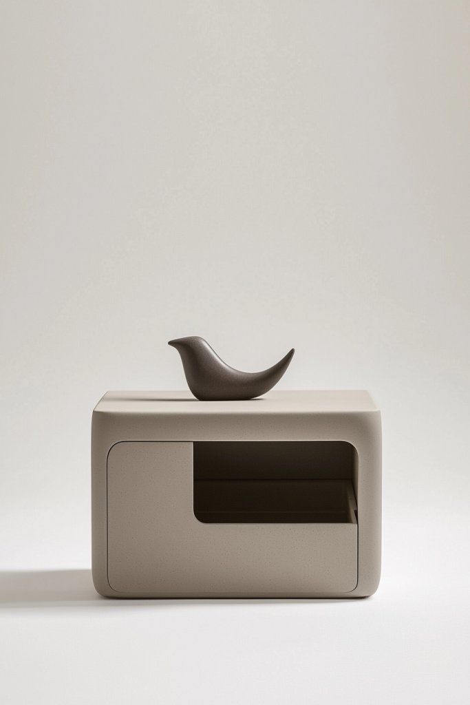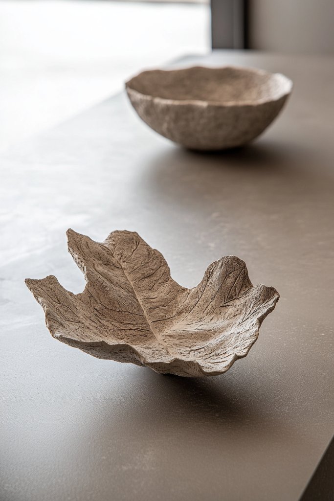 Visualize handcrafted ceramic or textured resin sculptures resembling stones or bark, arranged on a console or shelf. Or imagine decorative ceramic bowls with embossed patterns mimicking leaves or flowers, placed alongside sculptural objects like woven spheres or textured sculptures. These elements evoke the essence of nature through tactile surfaces and organic shapes, creating a calming, earthy vibe. Soft, neutral tones keep everything grounded and versatile.