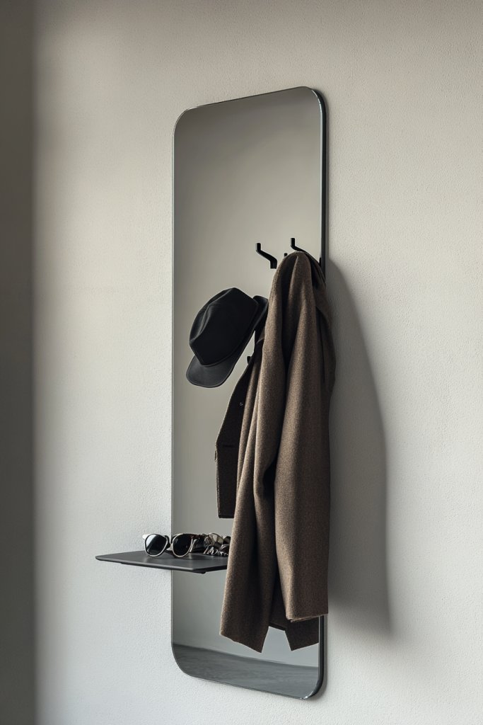 Imagine a sleek, full-length mirror with a narrow shelf or small hooks integrated into its frame. Hang your coats or hats on the hooks, while the shelf holds small essentials like keys or sunglasses—hidden behind a mirror panel or in a small pocket. The mirror’s clean lines reflect light and space, making the area appear larger. The combination of reflective surface and storage creates a balanced, modern look that’s both practical and attractive.