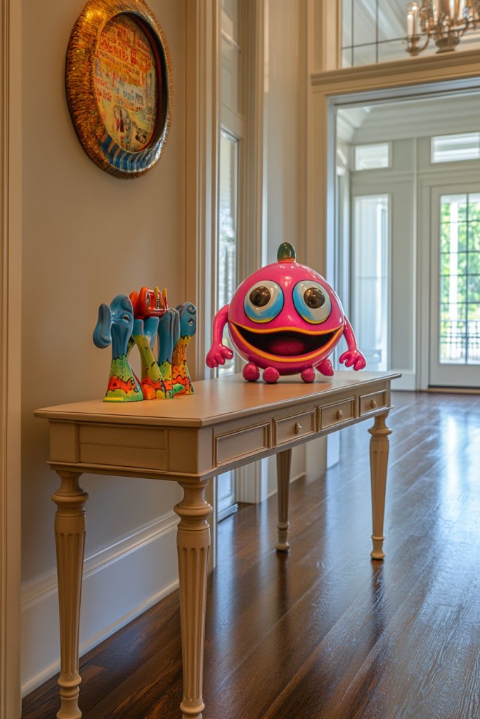 Imagine a colorful sculpture or quirky figurine as the focal point, paired with unexpected decor like a playful wall hook or a vibrant patterned rug. Bright colors, unusual shapes, and whimsical textures create a lively, inviting vibe. Small decorative items—like a cheerful ceramic animal or a funny quote sign—add humor and personality. The overall look feels curated, cheerful, and full of surprises, making guests smile as soon as they step inside.