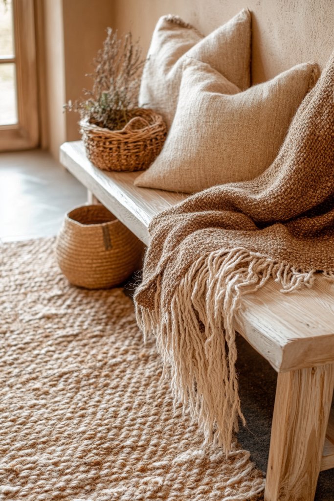 Start with a textured rug or mat as your foundation. Add a woven or distressed wood console, then layer textiles like throws or cushions in earthy tones. Decorate with baskets for shoes or accessories, and incorporate small sculptural or ceramic accents. Use warm, ambient lighting—like string lights or lanterns—to enhance the cozy feel. Regularly refresh textiles and accessories for seasonal updates, keeping the space lively and inviting.