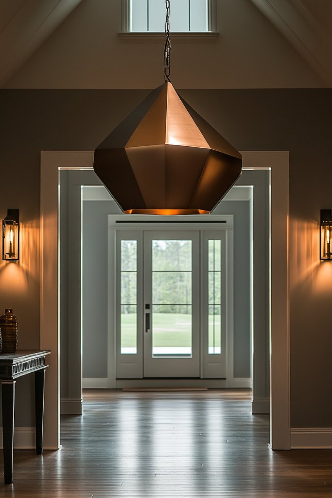 Imagine a console table with clean lines and sharp angles, adorned with geometric sculptures in shiny brass or matte black finishes. Metallic accents reflect light and add a touch of sophistication, while geometric patterns in rugs or wall art create visual interest. The combination of sharp shapes and reflective surfaces gives your entry a dynamic, stylish vibe. Subtle lighting highlights the metallic details, making them pop.