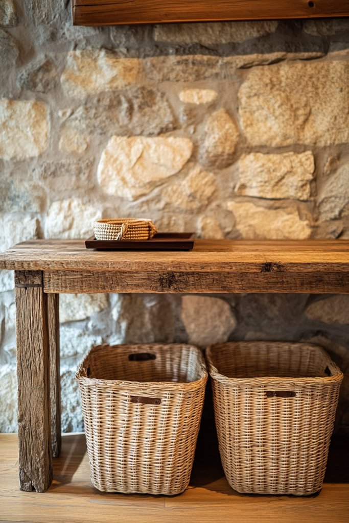 4. Rustic Wooden Console with Woven Baskets