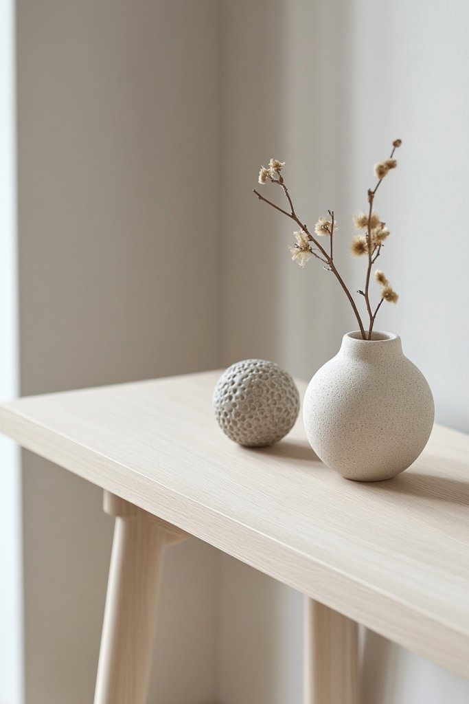 Envision a light wood console with sleek, straight lines paired with soft textiles like a textured throw or a woven basket. The color palette is neutral—whites, beiges, and soft grays—creating a soothing atmosphere. Subtle details like a ceramic dish or a small textured sculpture add interest without overwhelming the space. Natural light filters in, highlighting the understated beauty of the simple, functional pieces. The overall look is airy, organized, and effortlessly stylish.