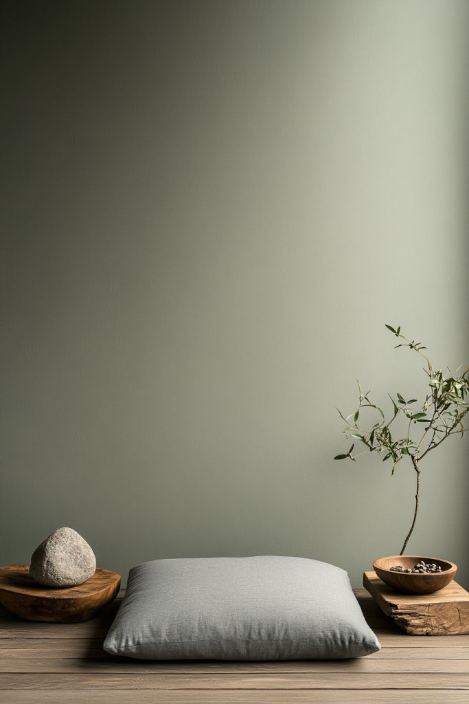 Imagine a quiet corner with walls painted in a matte Evergreen Fog, complemented by a simple floor mat or cushion in natural fibers like jute or linen. The space is free of clutter, with a few carefully chosen elements—perhaps a small wooden sculpture or a stone ornament—that evoke nature. Light filters softly through sheer curtains or open windows, creating a diffuse glow. The overall vibe is earthy, balanced, and profoundly calming—perfect for meditation or quiet reflection.
