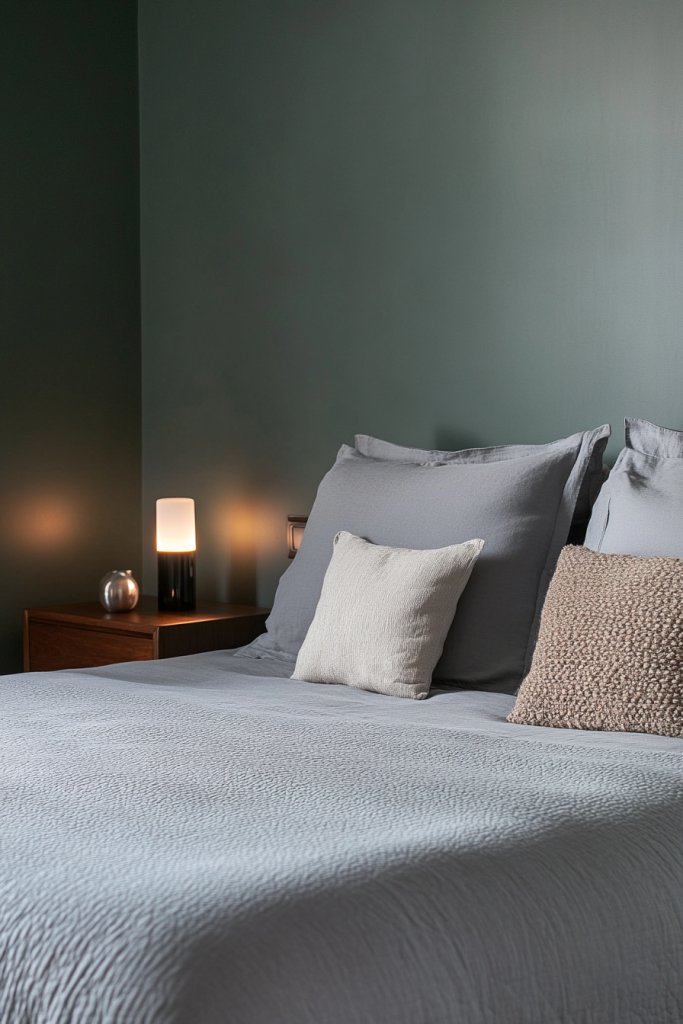 Picture a bedroom with walls painted in a matte Evergreen Fog, complemented by a bed dressed in crisp gray linens. Silvery lamps and minimalist artwork in white or muted tones add a modern touch. Textured cushions or throws in shades of gray or blue enhance the layered look. A sleek headboard and simple furniture keep the space uncluttered, while soft lighting creates a cozy, inviting atmosphere. The overall aesthetic is modern, tranquil, and effortlessly stylish.