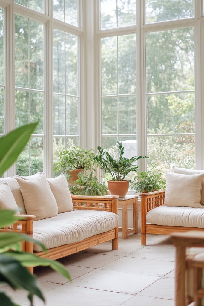14. Nature-Inspired Sunroom with Greenery and Earth Tones