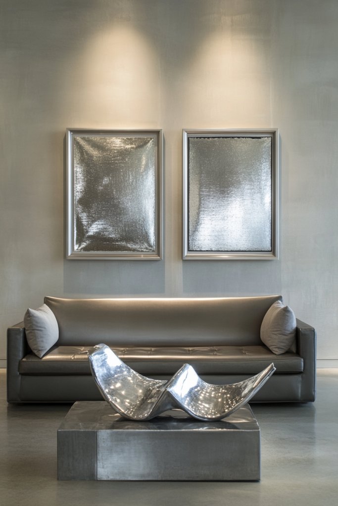 Choose artwork or sculptures in different metallic tones—silver, platinum, or brushed nickel—for variety. Incorporate textured or layered textiles to create depth. Use sleek, modern furniture with metallic accents to match the decor. This approach can be adapted to minimal or maximal styles, depending on your preferences, always emphasizing the metallic details.