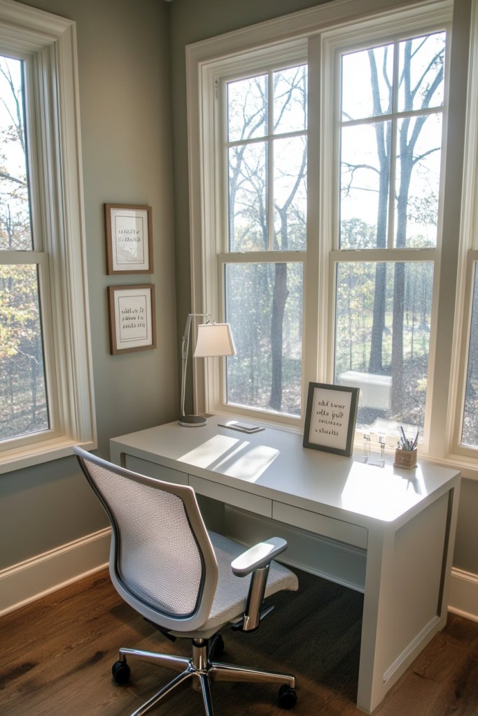 Start by painting the walls in Evergreen Fog, ensuring a smooth matte finish. Choose a simple desk in natural wood or painted in a light neutral, and incorporate storage solutions that keep clutter out of sight. Use natural fiber rugs and textured textiles for added softness and visual depth. Maximize natural light with sheer curtains that diffuse sunlight without blocking it. Select task lighting that complements the muted palette—think LED desk lamps with warm white bulbs. Keep surfaces clear and organize supplies in discreet containers to maintain serenity.