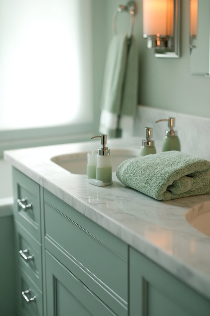 Begin by painting the walls in a matte Evergreen Fog, then select white fixtures with clean lines. Incorporate textured tiles or a pebble shower floor for tactile contrast. Use soft, plush towels and bath mats in shades of green and white. Add bamboo or wooden accessories like a soap dish or a towel rack for warmth. Use candles, diffusers, or essential oils to engage the senses and add a spa-like feel. Keep surfaces clutter-free by using discreet storage solutions for toiletries.