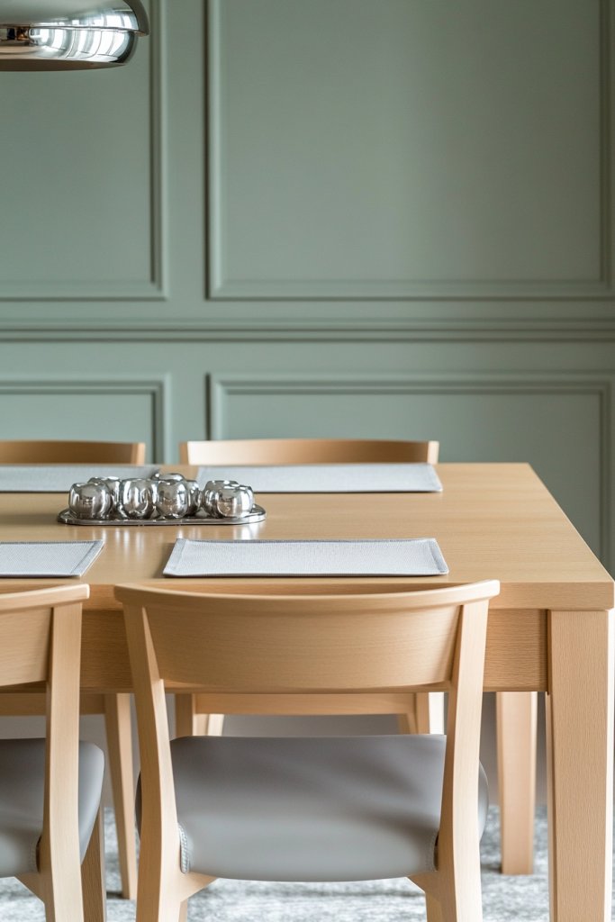 Picture a sleek dining table in a matte Evergreen Fog finish, surrounded by chairs upholstered in pale gray fabric. Silver tableware, cutlery, and decorative accents reflect light beautifully, adding a touch of glamour. Soft lighting, perhaps from a modern chandelier or sconces, casts a gentle glow, highlighting the metallic finishes. Subtle textured linens or placemats in pale gray enhance the understated elegance. The overall scene is refined, serene, and ready for entertaining.