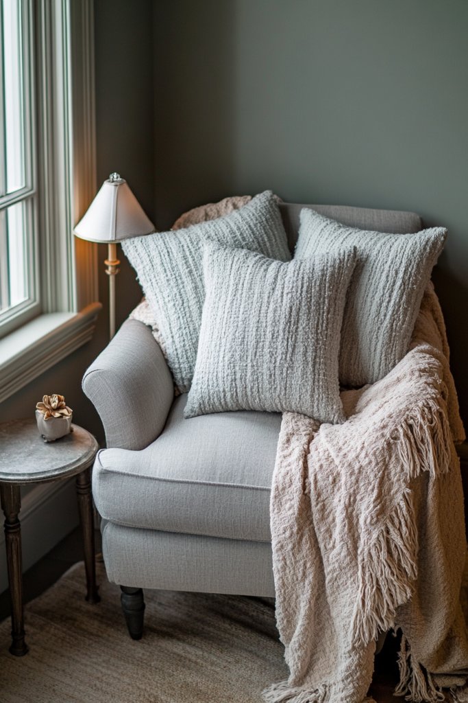 8. Cozy Reading Nook with Layered Textures in Cooler Tones