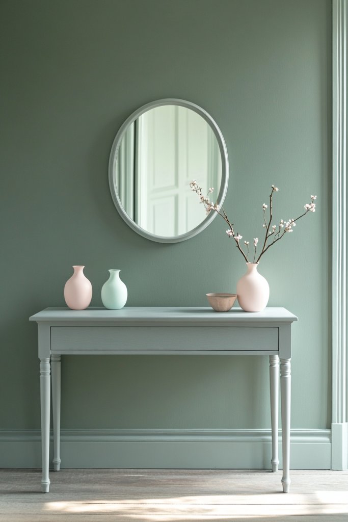 Begin with painting the walls in Evergreen Fog, then choose a light wood or white console or bench. Organize essentials in pastel baskets or trays to reduce clutter. Add a textured rug in soft neutrals or pastels to define the space. Use wall hooks or minimalist pegs for coats and bags, keeping the look sleek. Incorporate soft lighting with wall sconces or a small pendant to create a warm glow. Keep surfaces clear, and add personal touches like a small decorative mirror or a framed quote.