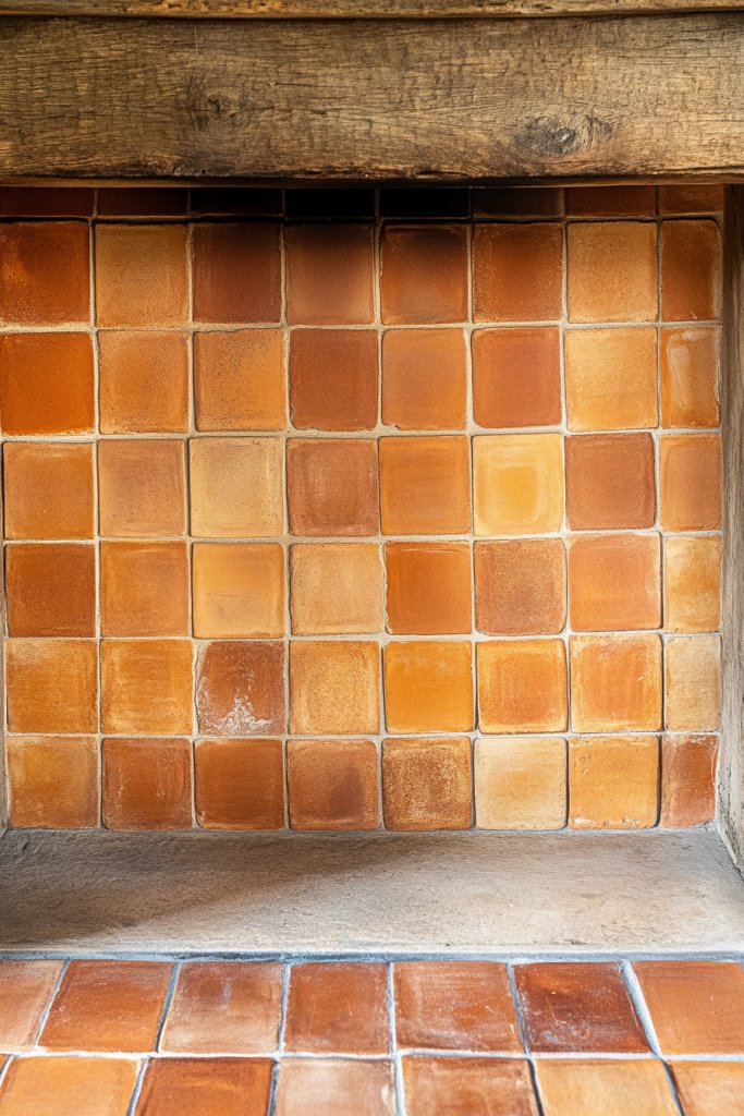 Pair terracotta tiles with distressed wood trims or vintage metals for a classic farmhouse look. They work well in small or large fireplaces, adding warmth without overwhelming the space. Seasonal decor such as cozy throws or rustic lanterns complements the earthy tones. Mix with neutral or warm textiles for a layered, inviting feel.