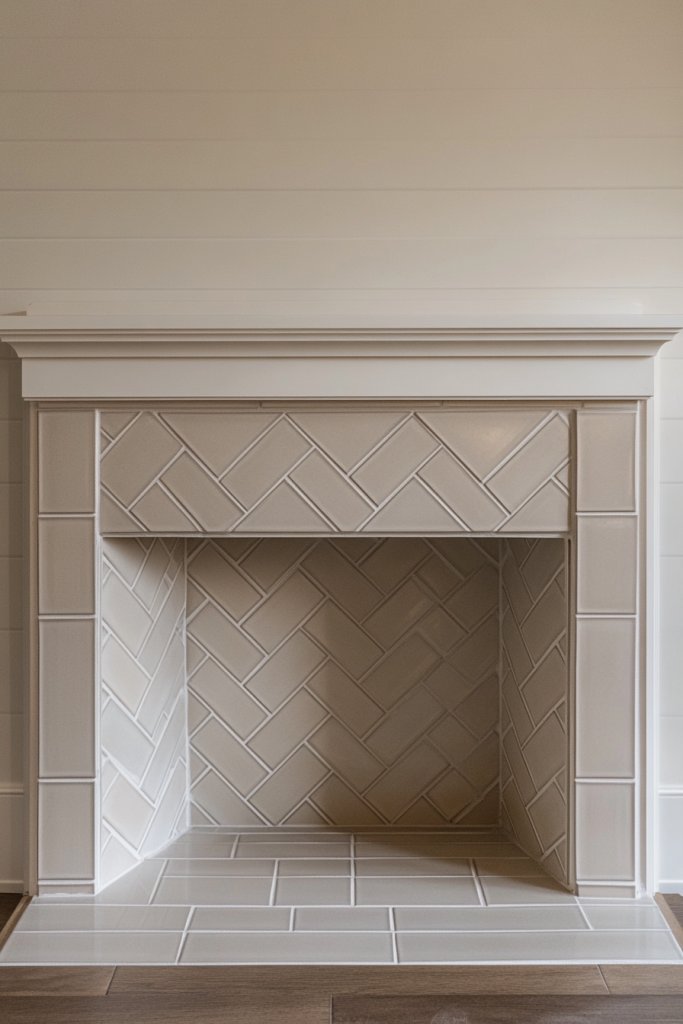 Want to add a touch of sophistication and motion to your fireplace? The herringbone pattern with neutral ceramic tiles offers a timeless yet dynamic look. If flat surfaces feel dull, this zigzag pattern injects energy and elegance into your space.