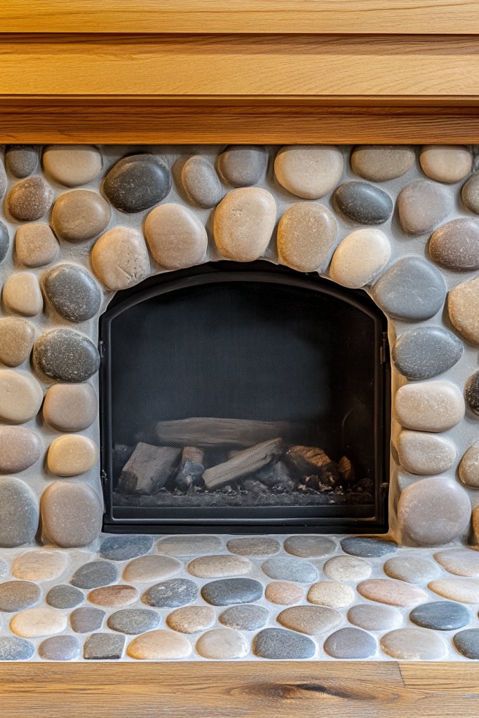 Pair pebble tiles with simple wood mantels or natural fiber textiles for a fully earthy look. They work well in small fireplaces or as accent surfaces in larger rooms. Seasonal updates include cozy textiles or natural accessories like woven baskets. They complement other organic elements such as clay or stone.