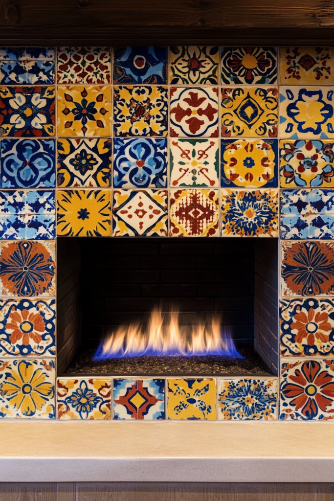 Imagine tiles with complex geometric or floral motifs in deep blues, warm reds, and earthy tones. The patterns are rich and detailed, drawing the eye in and inviting closer inspection. When installed on your fireplace, they transform a simple feature into a vibrant focal point full of character and history.