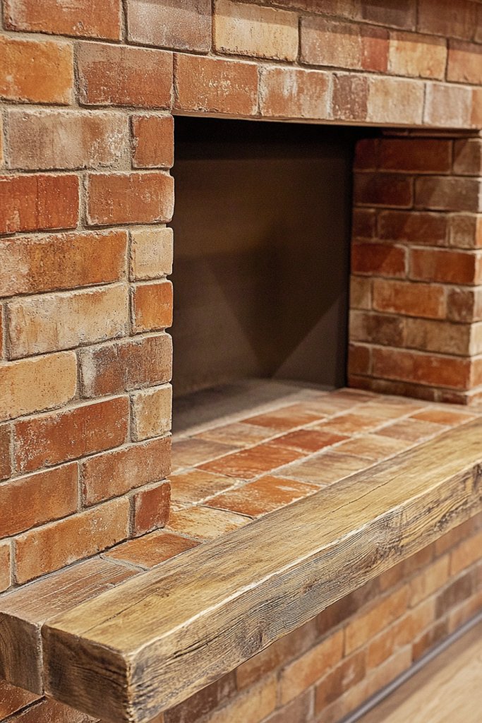 Distressed brick-look tiles give your fireplace instant character and warmth. They’re durable, easy to maintain, and age beautifully. This classic farmhouse look creates a cozy, nostalgic setting that feels both authentic and welcoming. Your space will radiate timeless charm and inviting comfort.